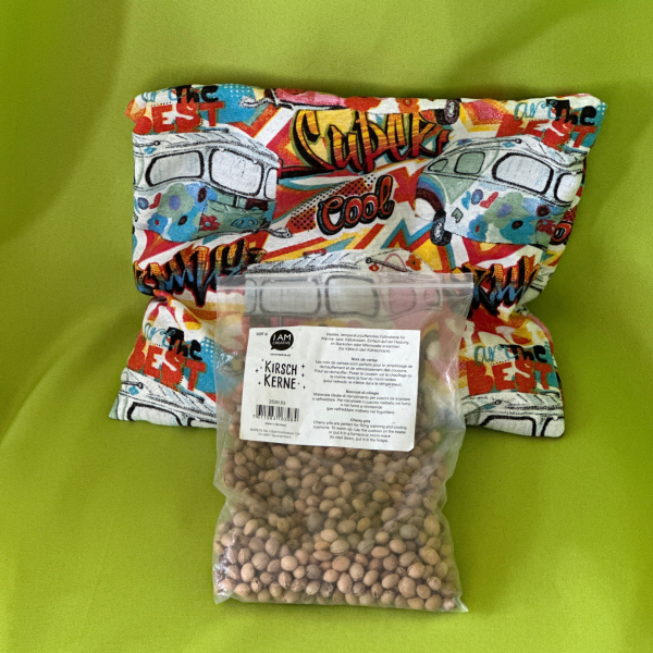 Kissen ist gefüllt, wahlweise mit Kirschkernen, Traubenkernen oder Rapssamen (Bei der Bestellung bitte vermerken).