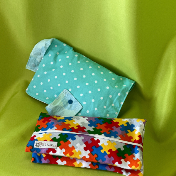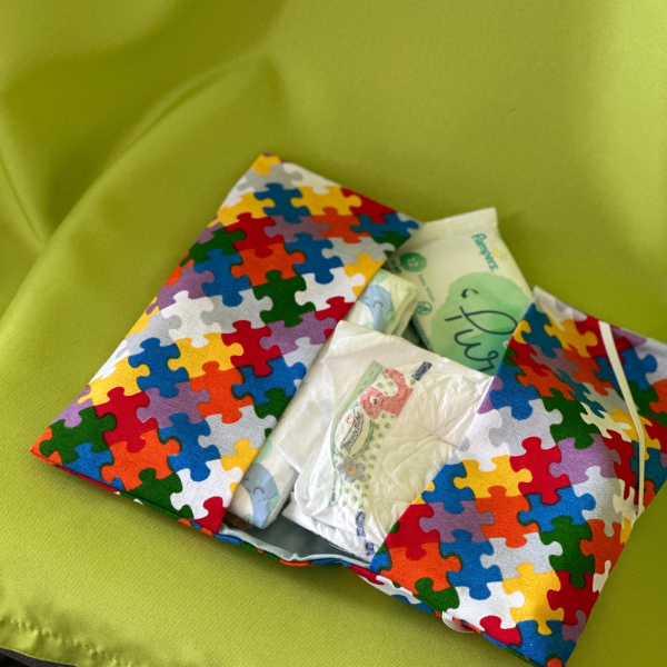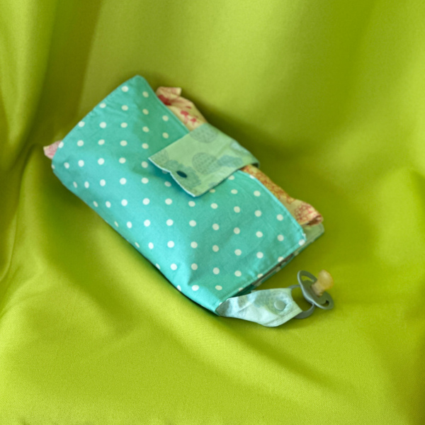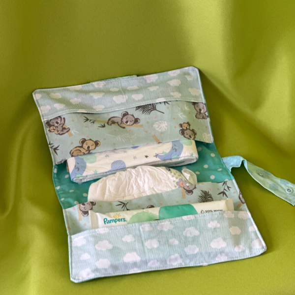 Praktische Windeltasche für Unterwegs, bereits mit Windeln, Feuchttücher und Duft-Abfallsäckchen aufgefüllt.